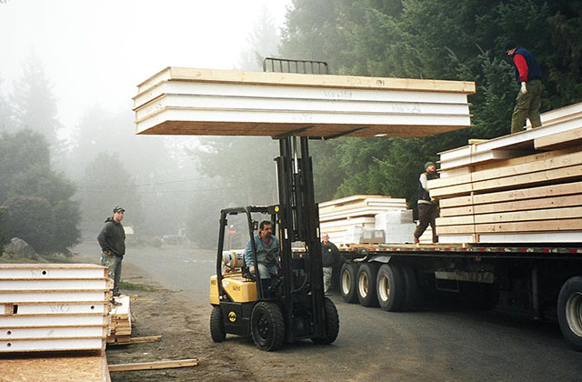 We ship our kits to your site by flat bed truck, and usually one to three truckloads are required, depending on house size and options chosen. Trucks can be unloaded by hand or using a forklift truck or other equipment.